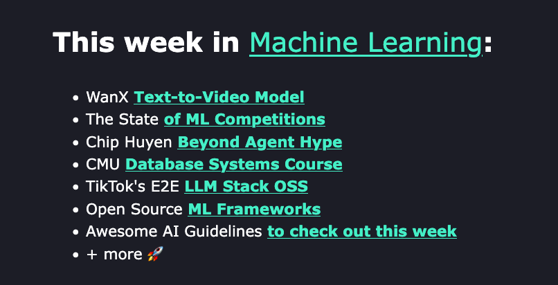 WanX Text-to-Video Model, The State of ML Competitions, Chip Huyen Beyond Agent Hype, CMU Database Systems Course, TikTok's E2E LLM Stack OSS + more 🚀
