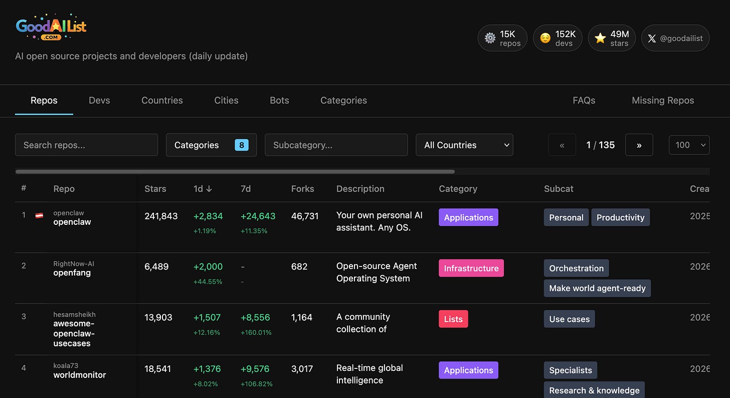 If youâre building ML systems in 2026, Chip Huyen released an actively updated list of the top and fastest growing AI open source projects sorted by category and sub-category, super useful: The Good AI List is updated daily as a leaderboard for tracking whatâs trending in open-source AI on GitHub indexing ~15K repos / ~150K developers. I really like how it is possible to find the fastest growing projects with 1-day and 7-day star deltas, which shows right now thereâs a massive explosion of accelerated popularity for repos across the board. For production ML practitioners, the practical value is triage and discovery, we can use it to spot fast-moving infra (agent runtimes, sandboxes, orchestration, RAG plumbing), emerging âskills/promptâ ecosystems, and tooling thatâs gaining real adoption signals. If you havenât this is definitely a resource that is worth checking out and bookmarking for reference as well.